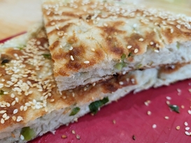Shanghai Scallion Flatbread, is a Chinese street food that is a great Chinese breakfast or a great "anytime" snack. Shanghai Scallion Flatbread is a leavened pancake cooked on the stove top. It has a crispy outer layer, coated in sesame seeds, and a soft fluffy center with a tender chew and a hint of flavor from the orient.