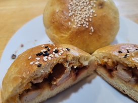 Bao (pronounced \bau\) is a traditional Cantonese bread, and can be prepared in a variety of ways. A bao with no filling is called "mantou" which could be loosely translated to "dinner roll". A bao can also be stuffed with various fillings and then either baked or steamed. A steamed, stuffed bao is called baozi (pronounced \bau·zē\). In this recipe, the bao are stuffed with a sweet and savory Char Siu Pork mixture, finished with an egg wash, and then baked.
