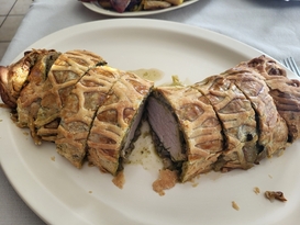 Beef Wellington is a dish made with the Beef Chateaubriand cut, the roast that is cut into filet mignon steaks. This cut can be expensive, often costing $200 to $300 per Roast. A cheaper solution can be made using the same cut, but from pork. The Pork Chateaubriand is called the Pork Tenderloin. It should be noted that this is not the same as the Pork Loin cut. The Pork Tenderloin is a tender, flavorful cut, costing a fraction of the price of the Beef version of the roast. This recipe uses a cooking method called "En croute", which is a French term that means "in a crust". The roast is wrapped in Puff Pastry dough (not Phylo dough) and then roasted. This recipe creates 2 Pork Wellingtons, one for each Tenderloin. Alternatively, you can create a single mega-tenderloin with the introduction of a powder substance called Transglutaminase (meat glue), to join the two tenderloins together and wrap in a single Puff Pastry.