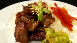 Bulgogi Beef (meaning "fire meat" ) is a tender, flavorful dish that is traditionally cooked on a grill. In this recipe, the Baking Soda is used to tenderize the meat, without turning the outer layer into mush as a longer exposure to acid based tenderizers tend to do. The Soy Sauce, garlic, and sugar adds a wonderful Bulgogi salty sweetness. Traditionally, Bulgogi Beef uses the Rebeye cut, but I have had equal success with Top Sirloin, Flank Steak, Skirt Steak, or even Shoulder Roast. The meat should be sliced paper thin while still raw.