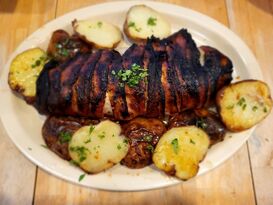 (Pronounced \brä·chē·ˈō·lə\) - The "Pork Loin" is not the same cut of meat as a "Pork Tenderloin." This pork loin recipe is easy to make and provides a lot of flavor. The Pork Stuffing will help give the Pork Loin a more mature flavor, so that you don't end up with a dry, tasteless Loin Roast. Serve with a side of roasted potatoes or over a bed of Basmati Rice. When cooking any type of roast, you should use a Meat Thermometer or an Instant Read Thermometer to ensure doneness. Slice the finished Brachiola into Pinwheels and serve with rice or potatoes.