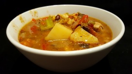 Locro is a flavorful stew that utilizes fall vegetables, like corn (hominy) and acorn squash. Traditionally, Locro de Argentina includes veal shoulder, pork shoulder, and Argentine chorizo. In this recipe, the veal has been replaced with beef shoulder, as it is easier to find. Argentine chorizo is an uncured (raw) sausage, made with a blend of ground beef and ground pork. The ground meat is often seasoned with garlic, paprika, and occasionally red wine. Argentine chorizo is typically grilled or occasionally smoked. In this recipe, Argentine chorizo can be replaced with any uncured, garlic sausage. Locro can be easily prepared and then put together in a slow cooker to tenderize the hominy, the legumes and the meat. The squash, legumes, and hominy are mashed to provide a creamy, thick stew. A flavored oil is drizzled on top for serving.
