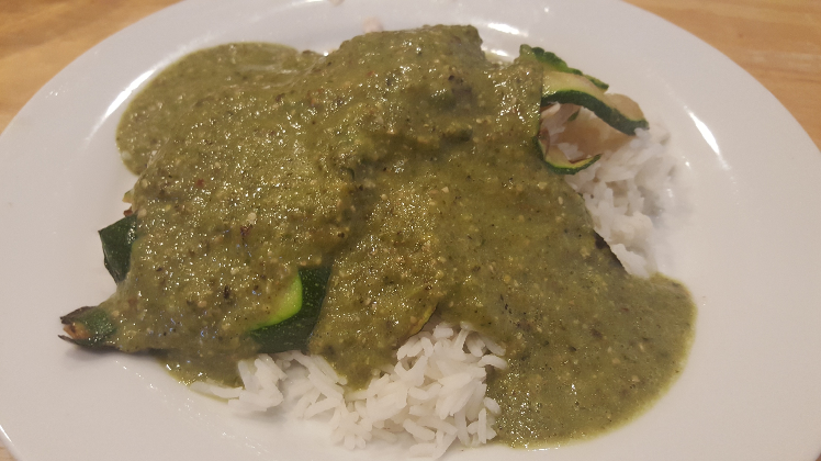 Plate a bed of Basmati Rice. Cover with a few slices of Zucchini. Add pieces of the poached Chicken. Cover generously with Green Mole Sauce. Garnish with a sprinkling of Sesame Seeds.